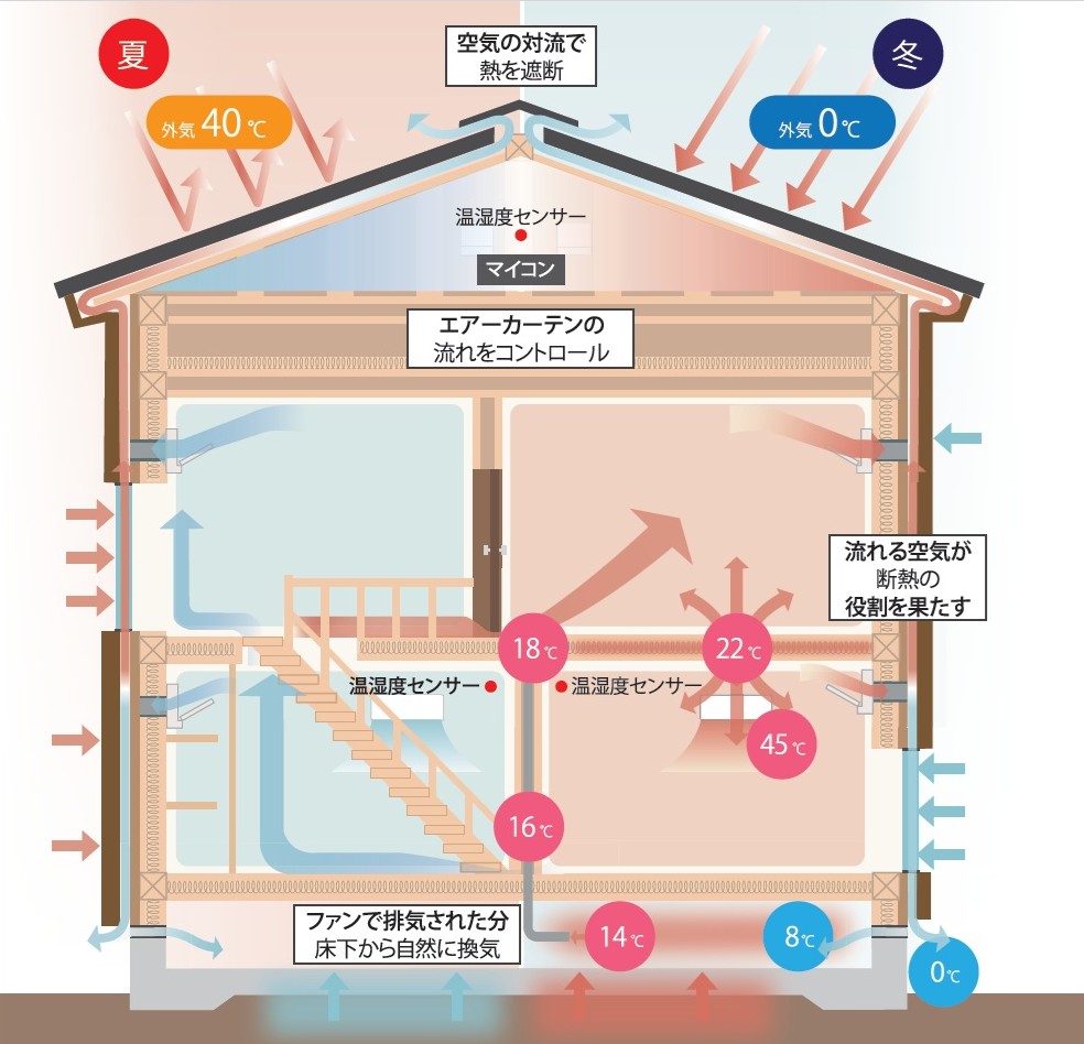 壁の中に空気の層を作り、その空気を循環させることで、夏は涼しく、冬は暖かい快適な住空間を実現します。